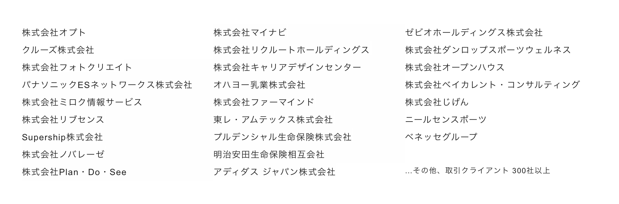 リクルート、三井化学、ライザップ、楽天、インタースペース、ワークスアプリケーションズ、いえらぶ、FCS、ホワイトプラス、WEVNAI、DeNA、イード、オプト、ユナイテッド、ワンスター、アイドマホールディングス、マクロミル、マクロアド、アトラエ、ファーストロジック、ZUU、Speee、JT、Yahoo、NetProtections、Nissay、fromScratch、三井住友海上、STARX、Leverages、Lifull、DHC、PLAN-B、SMS、DMM、NS Solutions、LJS、Donuls、KINTESU 、MACROMILL、FREEE、WILLGATE、LIVESENSE、LITALICO(リタリコ)、Gaiax、Atrae、じげん、ナイル、あしたのチーム、スターツグループ、スタークス、プログレス…その他…。